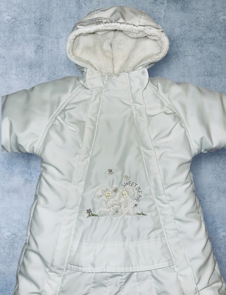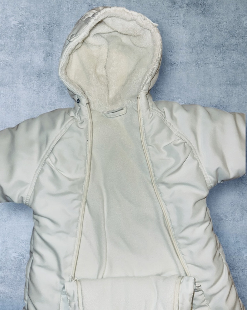 A krém színű külső réteg vízlepergető anyagból készült, így véd az esőtől és a hótól, a vastag, bélelt belső pedig garantálja a puha, meleg érzetet.